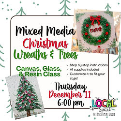 Mixed Media Christmas Wreaths & Trees: Canvas, Wood, Glass & Resin Class Join us for a creative evening as we bring Christmas to life with a stunning mix of canvas, wood glass, and resin! In this hands-on workshop, you’ll receive step-by-step guidance while learning how to layer textures and materials to create a one-of-a-kind seasonal artwork. ✨ What’s included: Step-by-step instructions from our instructor All supplies provided The freedom to customize your art to fit your style and make it shimmer with resin and glass! Perfect for all skill levels , this class is a fun way to welcome Christmas while exploring new art techniques. Gather your friends or come solo and leave with a piece that’s uniquely yours. 📅 Date: Thursday, December 11th ⏰ Time: 6:00 PM 📍 Location: The Local Spark Art Enrichment Studio, 302 E Main Street, Cabot (must be 7 years and up) Reserve your spot today and create fabulous art that will sparkle all season!